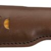 Allbrukskniv.Skaft av masurbjørk innsatt i olje.Messingknupp. Lengde 90mm. Blad av 3-lags rustfritt stål. Gjennomgående tange. Klinket. Slire av ekte lær med emblem: Selburosa.